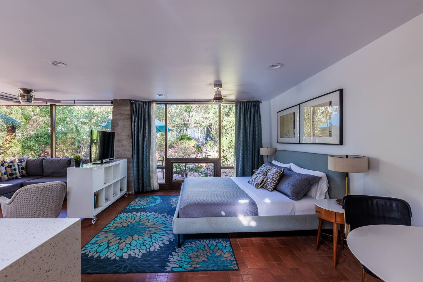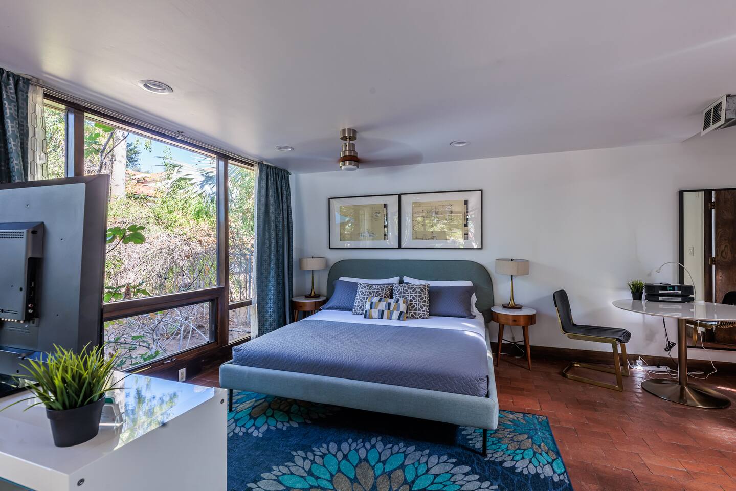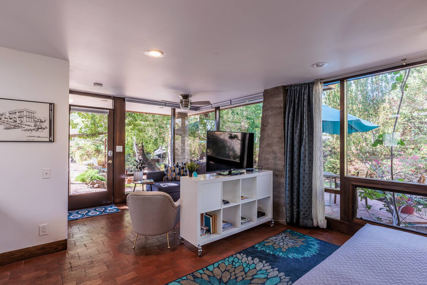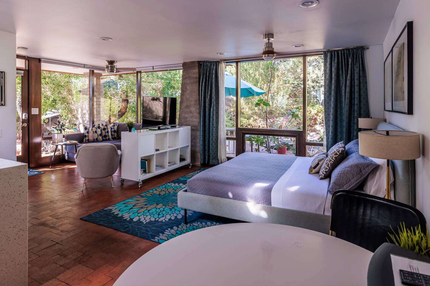 For two decades the Studio was the creative space of the Wrightsian architect who designed and built our beautiful, unique property. In January 2014 we converted his architectural studio to a luxurious and private living space by adding a full bathroom and kitchen, modern day amenities and new furniture. Look for us online: #VillaParadisoPhoenix Permit STR-2025-001825